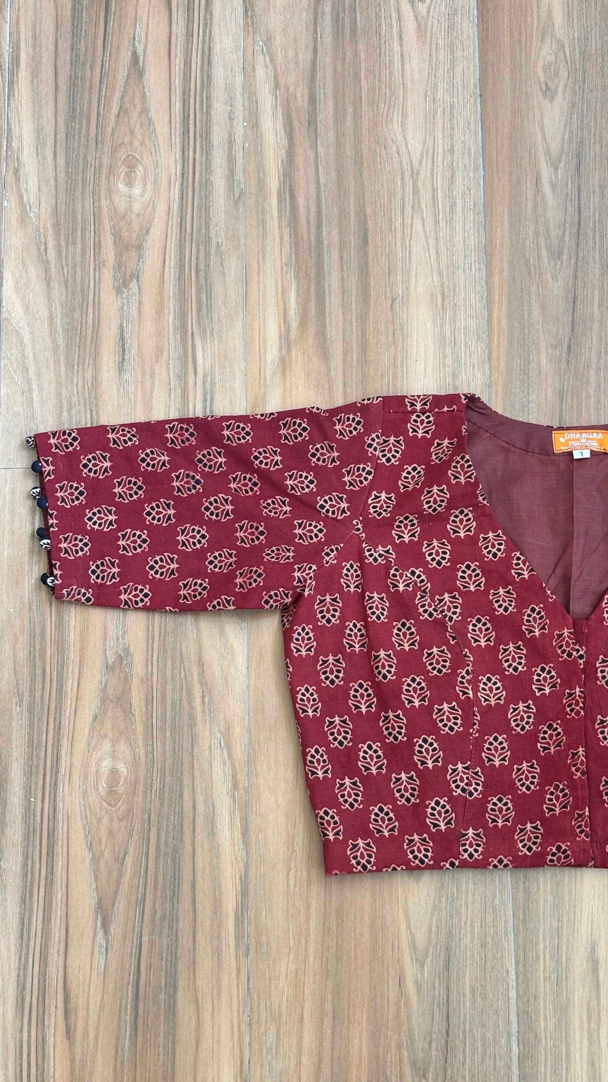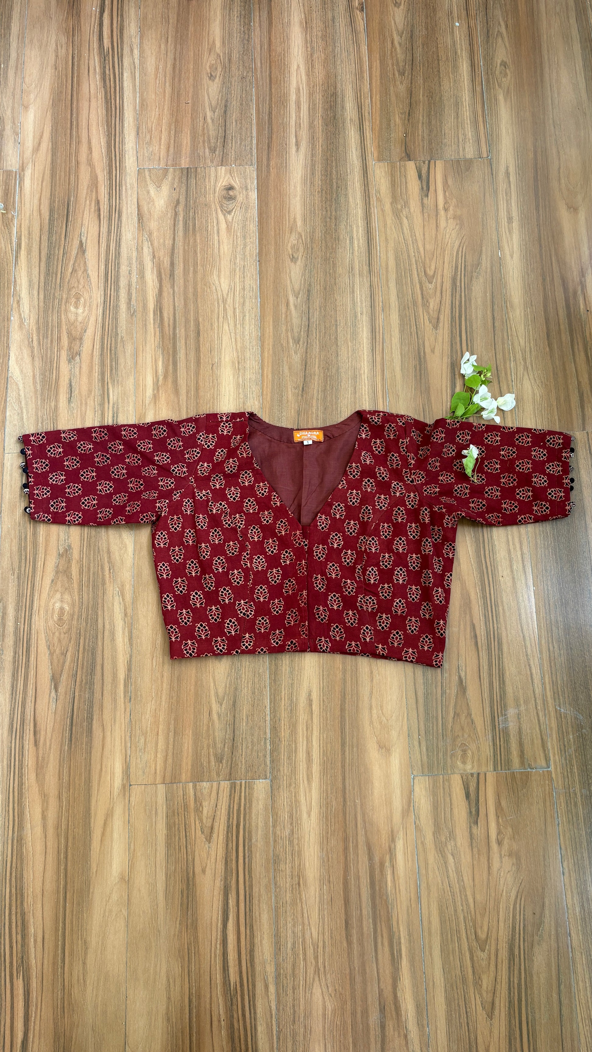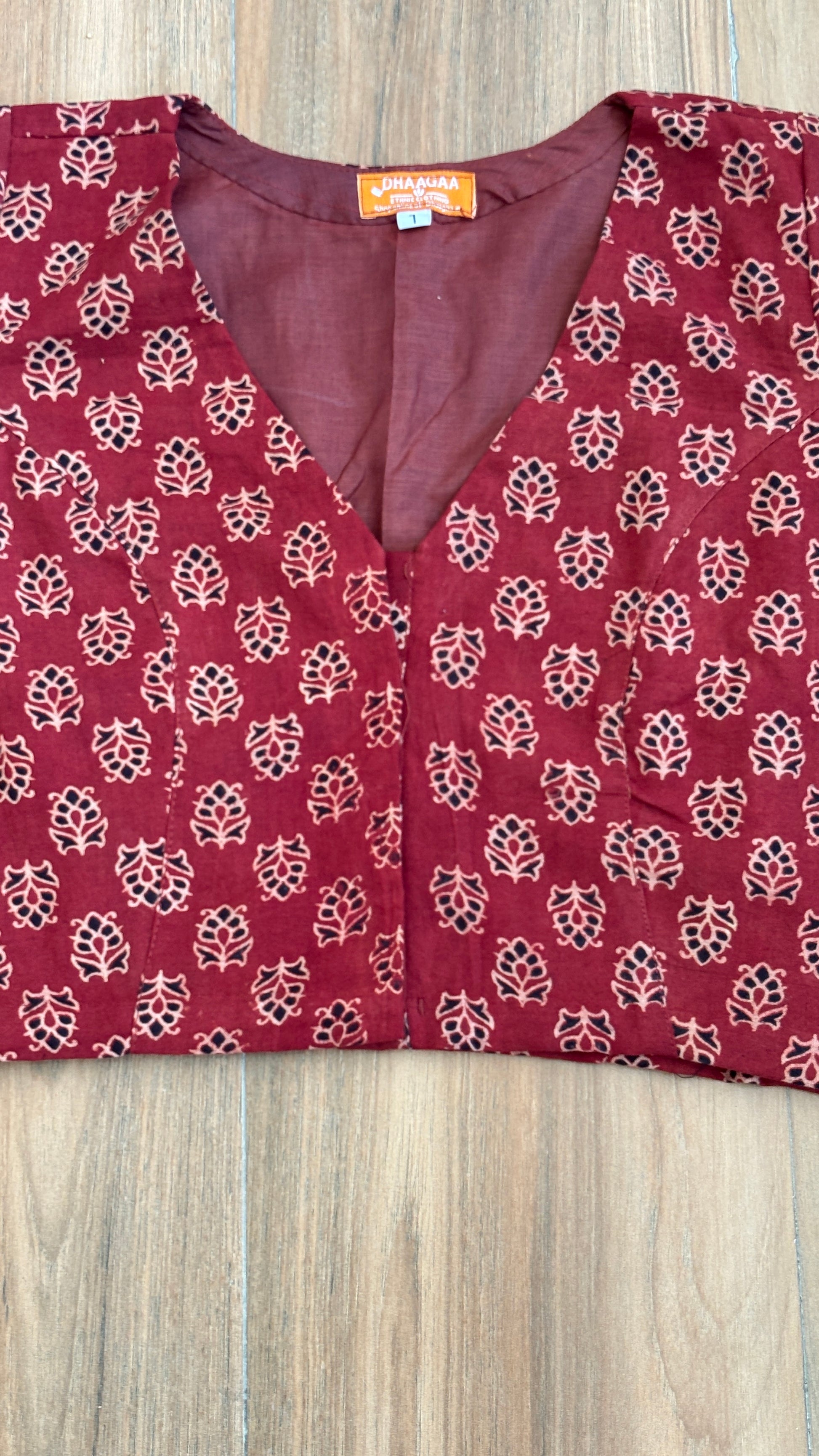 Dark Red Small Floral Motif Cotton 'V' Neck Blouse With Cotton Lining. For size chart refer to the last picture
