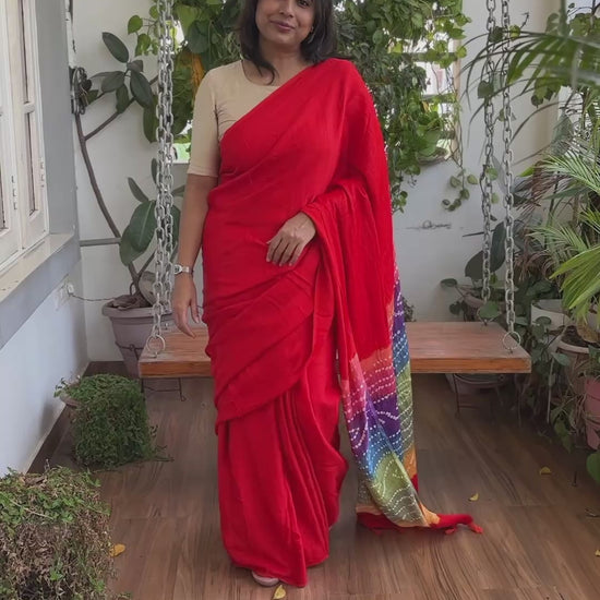 Orange Solid Colour Semi Modal Saree with Multi Colour Bandhej Palla