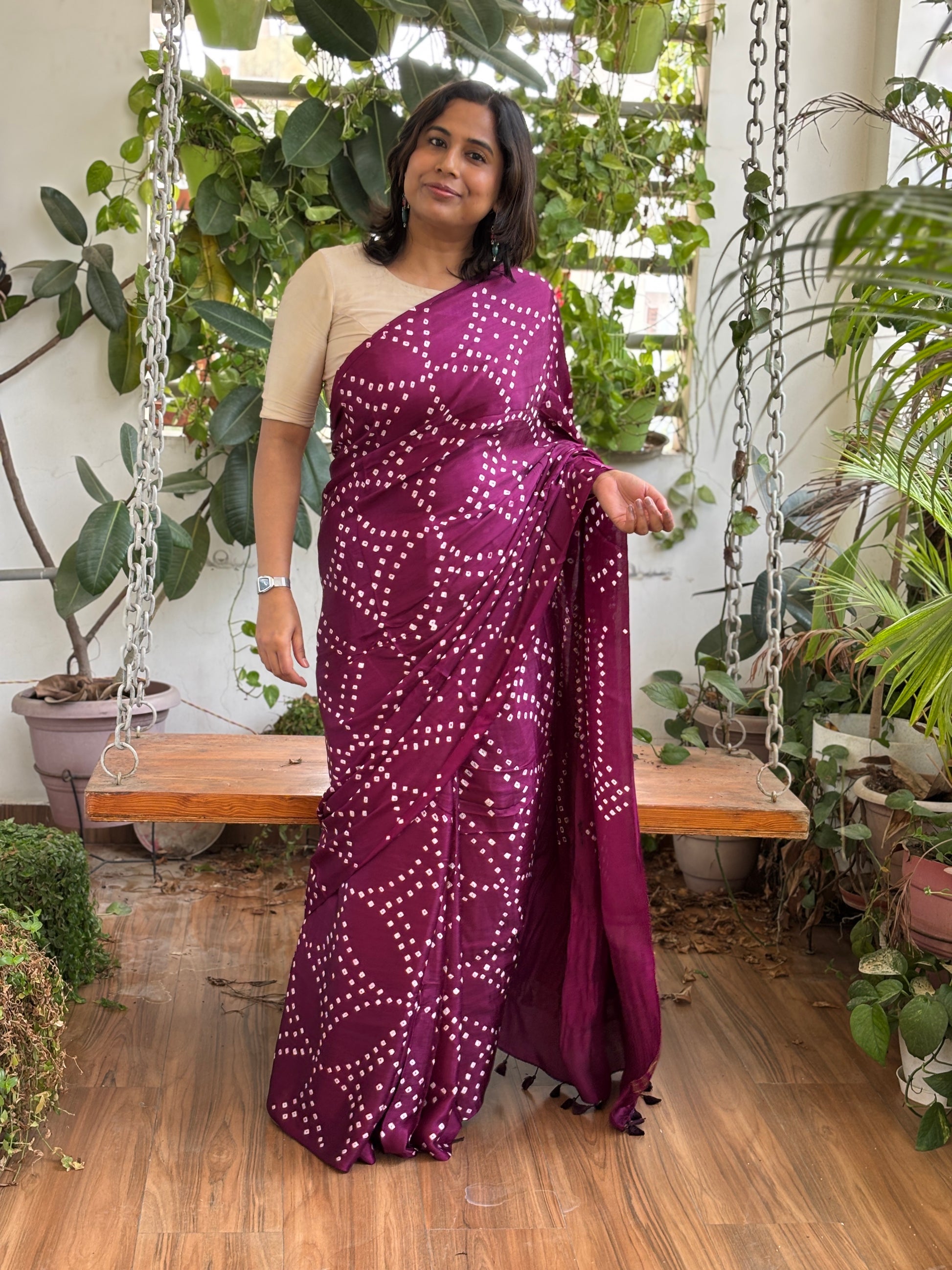 Solid Colour Semi Modal Saree with Bandhej and Tissue Palla