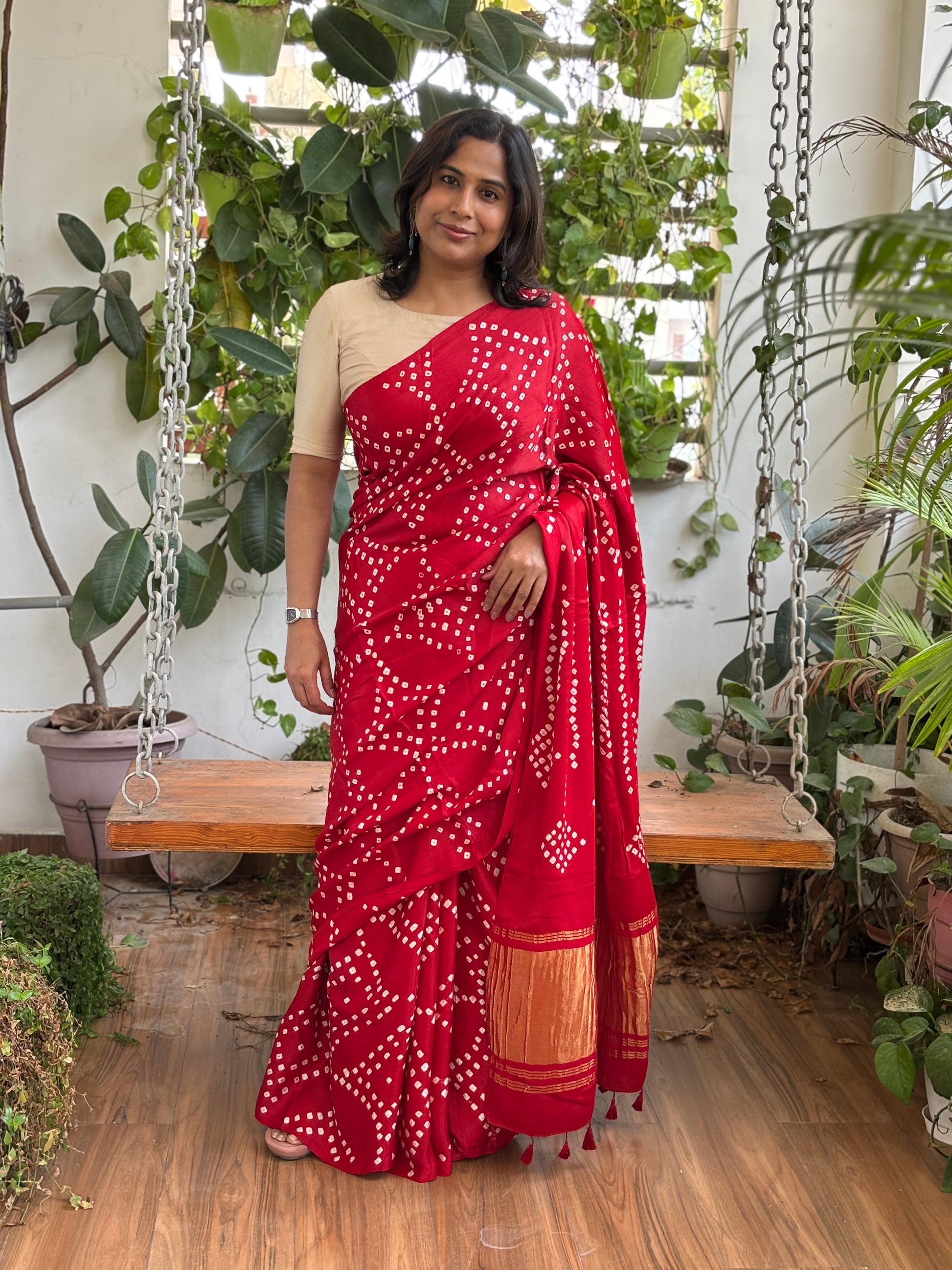 Solid Colour Semi Modal Saree with Bandhej and Tissue Palla